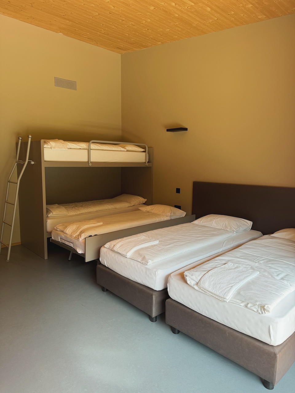 Uns wurde ein 8er Zimmer zugeteilt, was bei uns ja nahezu aufgeht ;). Damit wir nicht zuviel Schleppen mussten, wurden uns für die Kinder Baumwollschlafsäcke für unterm Duvet zur Verfügung gestellt - Mäni und ich hatten Seidenschlafsäcke dabei. Ein Raum hell durchleuchtet mit Blick auf Berge aufgrund den bodentiefen Fenstern. Das Gazosa, den Aperol Spritz und die Crogs genossen wir besonders.