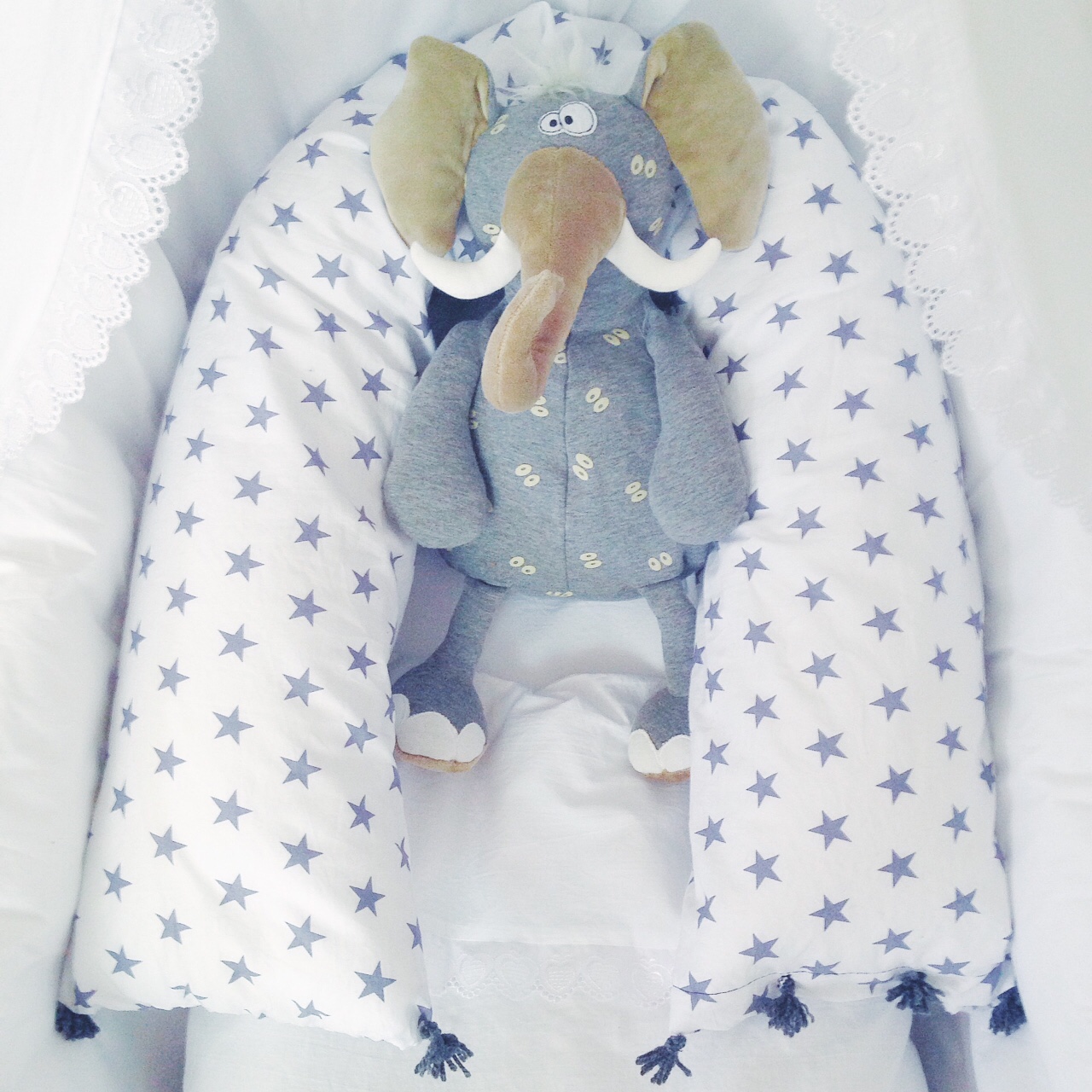 Damit sich unser Baby-Bäumchen noch lange geborgen und behütet fühlt - wie im Bauch - habe ich ein (keine Ahnung wie man dem Teil sagt und ich nenns:) Beschützer-Kissen genäht. Der Stoff kommt übrigens auch von einem meiner Lieblingsshops: dem Jakobs-Markt - dem Einkaufsparadies im Emmental :).