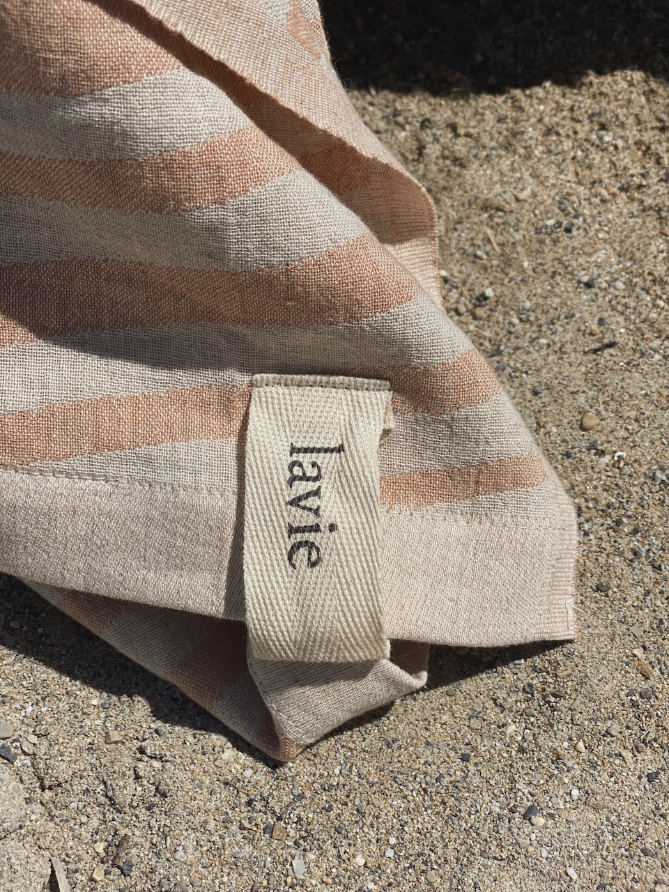 #lavie - macht Heimtextilien aus Bio-Baumwolle und Leinen. Alle Produkte sind nachhaltig und fair in Portugal produziert. Zeitlos für jeden Alltag, egal wo und bestenfalls ein Leben lang, weil eben aus hochwertigen Materialien. Bei Ole handelt es sich um ein GOTS zertifiziertes Hamamtuch und besteht aus 70% gekämmter Baumwolle und 30% Leinen und ist garngefärbt.
