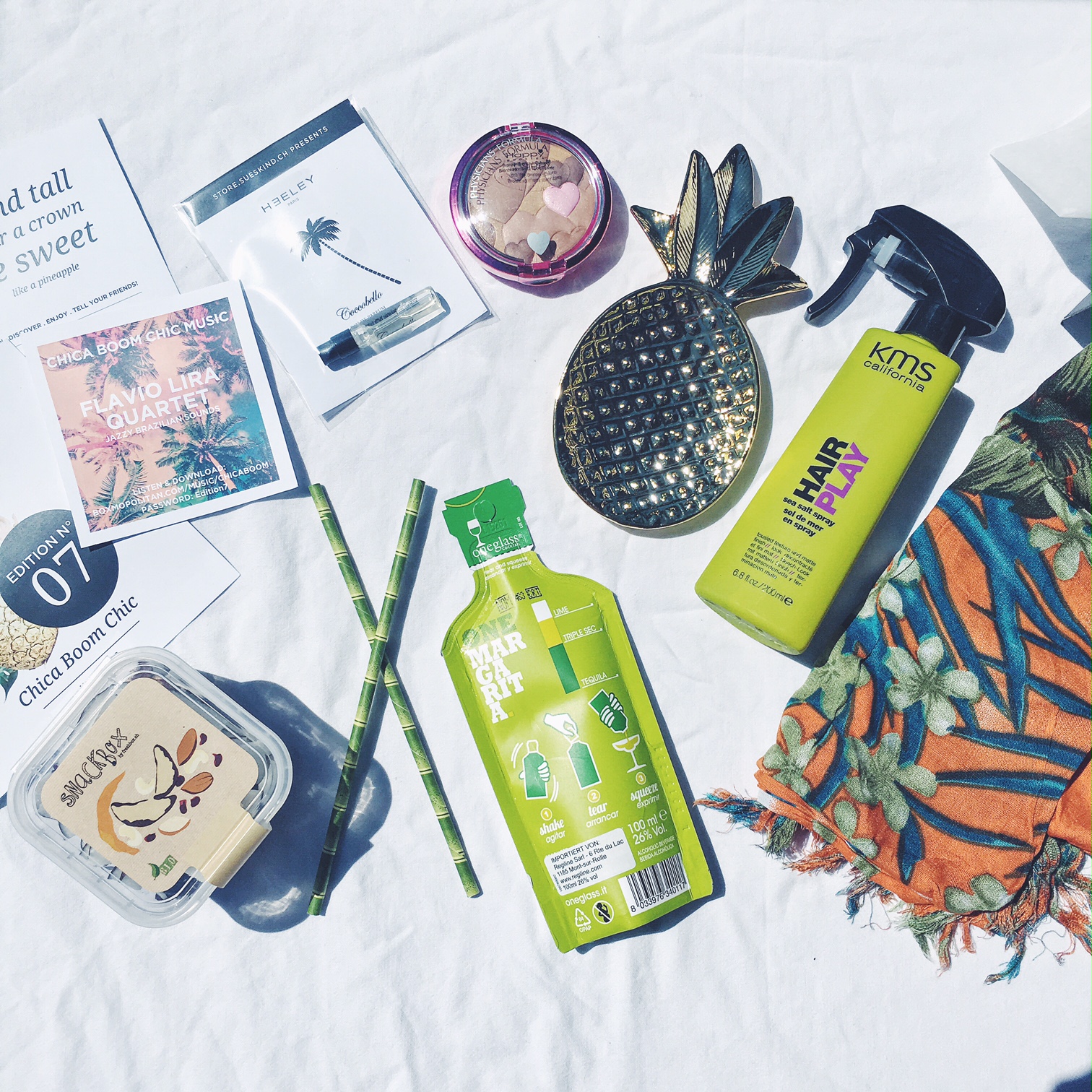 Da war dabei: Snack-Box von Freshbox, Strohhalme in Bambus-Optik, Margerita im Beutel, Mini-Duft Coccobello von Heeley, Bronze-Rouge von Physicians Formula, Ananas-Schale, Sea Salt Spray von KMS California und ein schönes Strandtuch im Hawaii-Look.